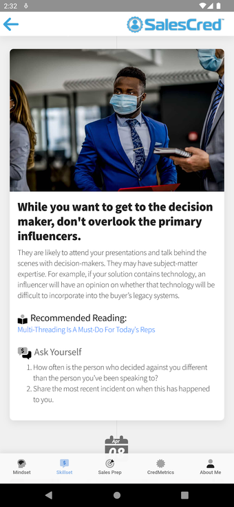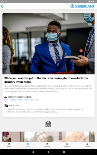 SalesCred® 是由salesfuel开发的一款免费的Android应用程序,旨在帮助销售人员通过提高销售信誉来实现“值得信赖的顾问”地位。该应用程序通过改善销售准备、软技能、销售技巧和数字存在帮助用户建立销售信誉。该应用程序提供免费评估,揭示销售优势和不足,并提供每天个性化的CredTips,以实现实质性的改进。